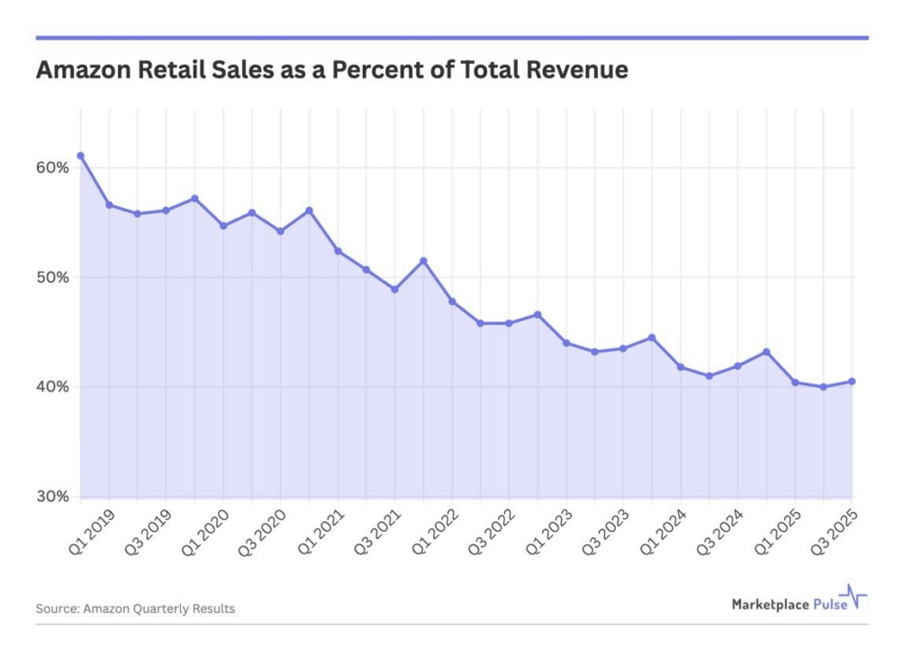 Tokom poslednjih nekoliko godina, Amazon je tiho, ali temeljno promenio svoj identitet. Nekada sinonim za online prodaju, danas se nalazi na raskrsnici između tehnologije, oglašavanja, infrastrukture i logistike. Najnoviji podaci pokazuju da je udeo retail prodaje u ukupnim prihodima Amazona pao sa 60% u 2019. godini na svega 40% u 2025. – što predstavlja istorijski zaokret u poslovnom modelu jedne od najuticajnijih kompanija na svetu.