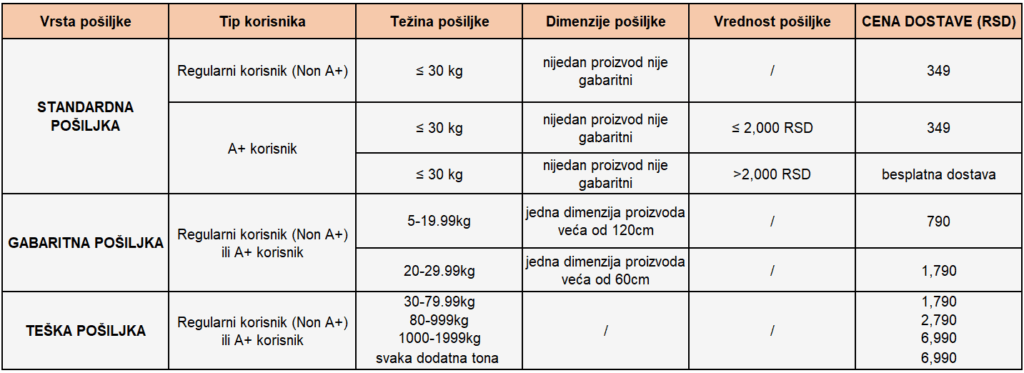 - Troškovi dostave se obračunavaju po važećem cenovniku istaknutom u Opštim uslovima kupovine i oni su sledeći: