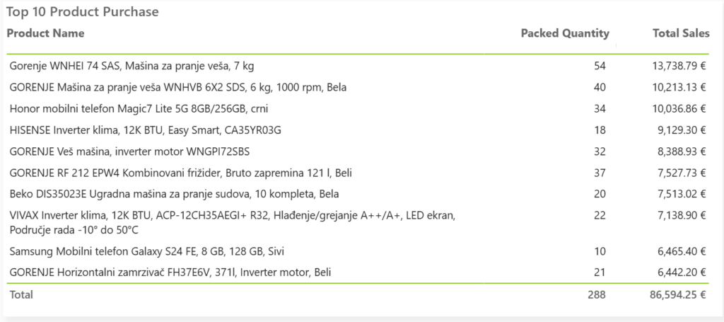 • Lista deset najprodavanijih proizvoda u izabranom vremenskom periodu.